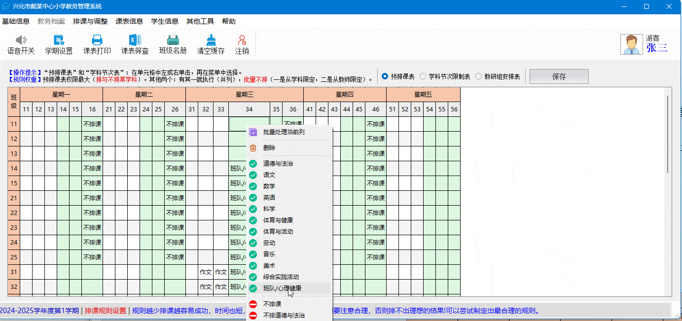 自动排好后,会以上面图呈现,按住左键可以手动调整,违反排课规则会以不同颜色提示。调整好后,要保存。