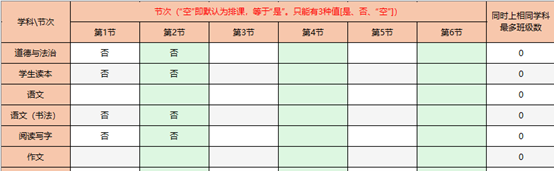 本规则分为两种,一是节次限制:比如体育,不排上午第1和第2节;二是相同学科同时上限制(最后一列):比如信息技术,机房只有3间,那么信息技术限制为3,全校同时上最多为3个班。再比如操场不大,同时上只能容纳5个班,那么此处填写5。