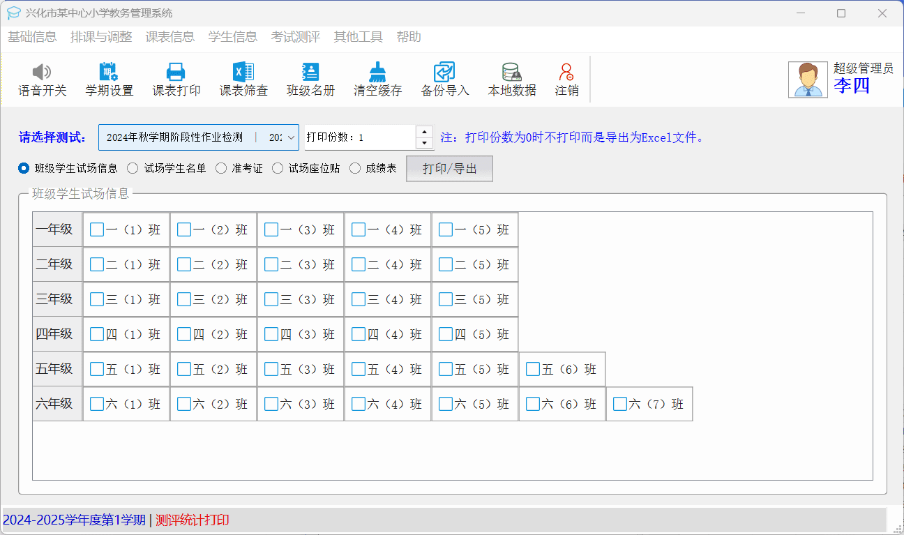 3.点击上方各年级按键,进行试场安排。
