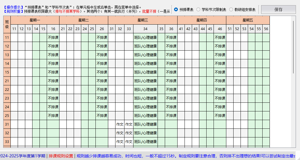 本规则分为两种,一是节次限制:比如体育,不排上午第1和第2节;二是相同学科同时上限制(最后一列):比如信息技术,机房只有3间,那么信息技术限制为3,全校同时上最多为3个班。再比如操场不大,同时上只能容纳5个班,那么此处填写5。