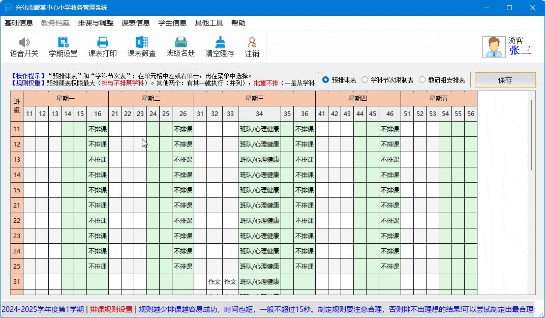 自动排好后,会以上面图呈现,按住左键可以手动调整,违反排课规则会以不同颜色提示。调整好后,要保存。